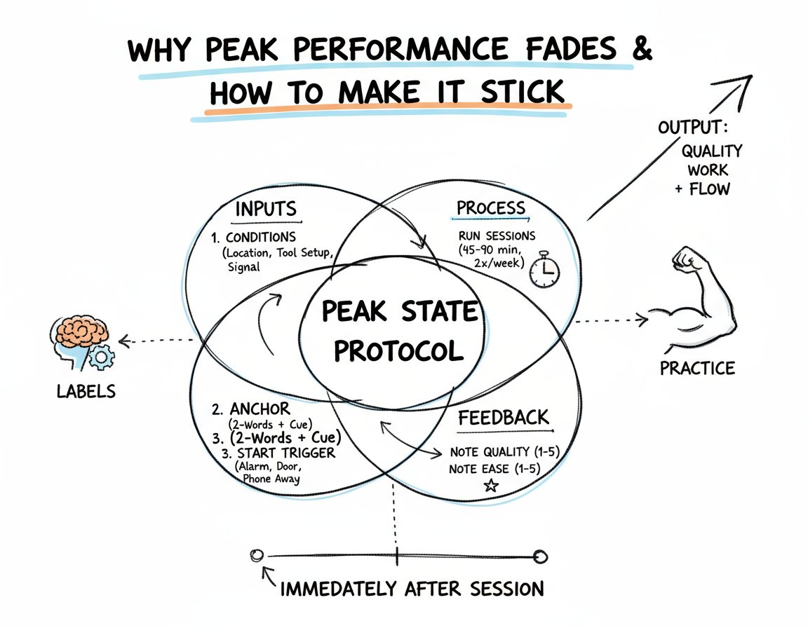 Pick your last peak performance hour. Write down the three conditions that made it work (location, tools, signals). Name that state in two words and link it to one visible cue you can trigger.
